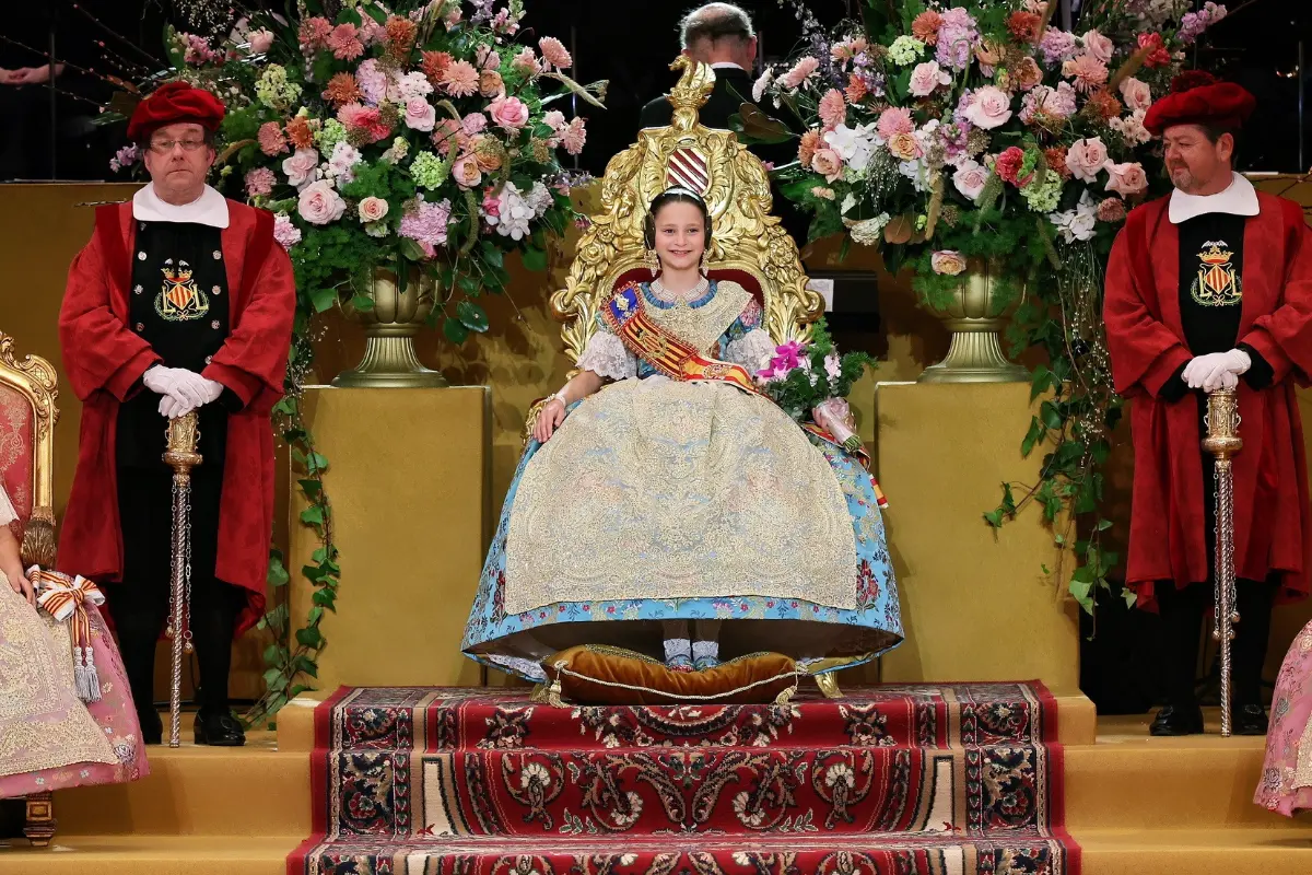 Con la sala en pie, la ceremonia condujo hacia el momento más esperado. En el recitado previo a la entrada de la Fallera Mayor Infantil, se escucharon palabras como estas, dichas de manera literal en el acto: