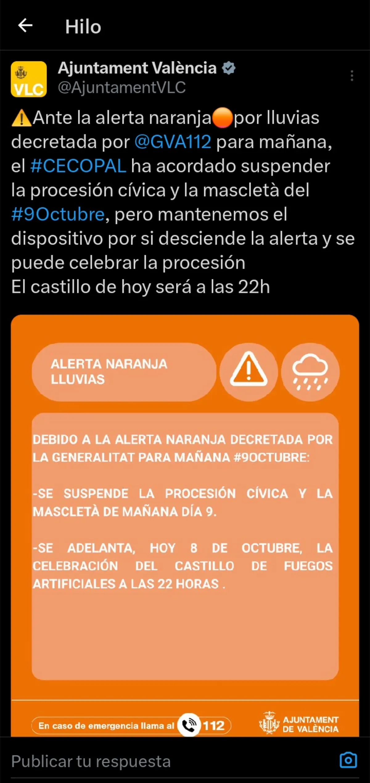 València suspende la Procesión Cívica del 9 d’Octubre a raíz de la alerta amarilla por lluvias intensas y tormentas. La decisión, adoptada en el Cecopal, prioriza la seguridad de la ciudadanía y activa medidas preventivas complementarias. Además, se suspenden la Mascletà del 9 d’Octubre y el espectáculo de drones previsto para este miércoles, mientras que el castillo de fuegos se adelanta a las 22:00. Se mantienen, con normalidad, los actos de este miércoles 8 de octubre como la exposición “La Nostra Senyera”, la muestra de folclore y la dansà popular.