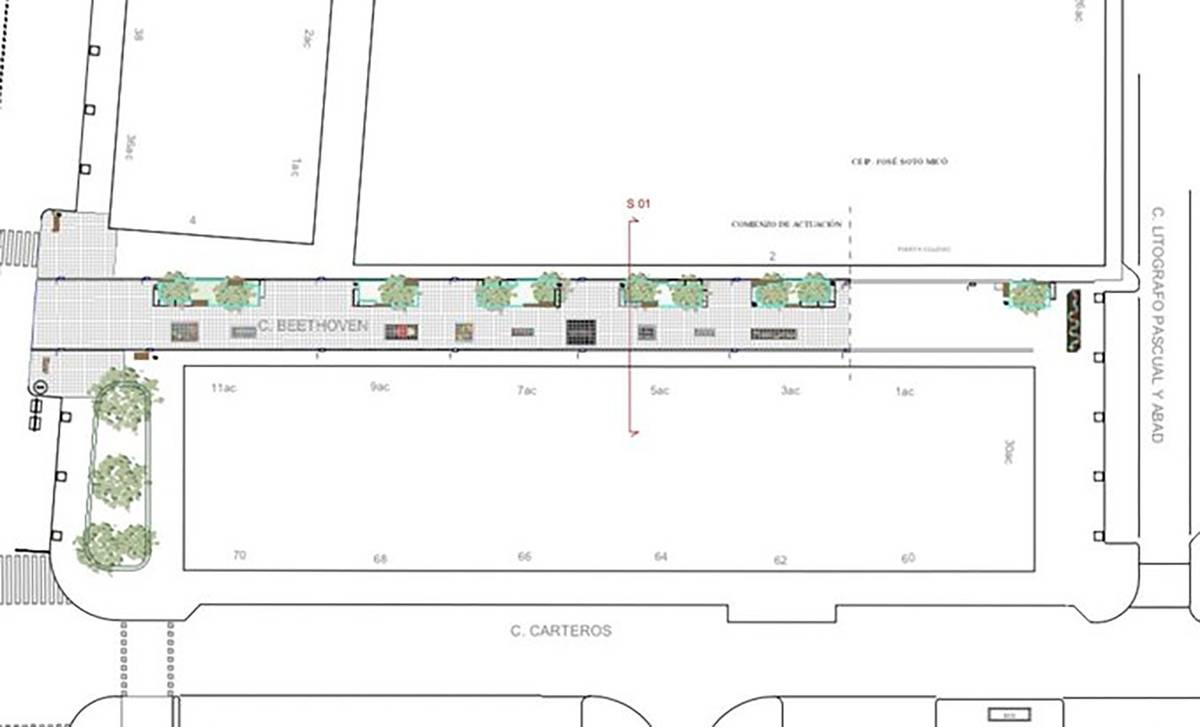 En esta actuació també s’inclou la conversió del carrer Beethoven en zona de vianants, el qual se sumarà a eixe gran espai públic que comentava la regidora. En la imatge es pot vore l’actuació prevista a este carrer.